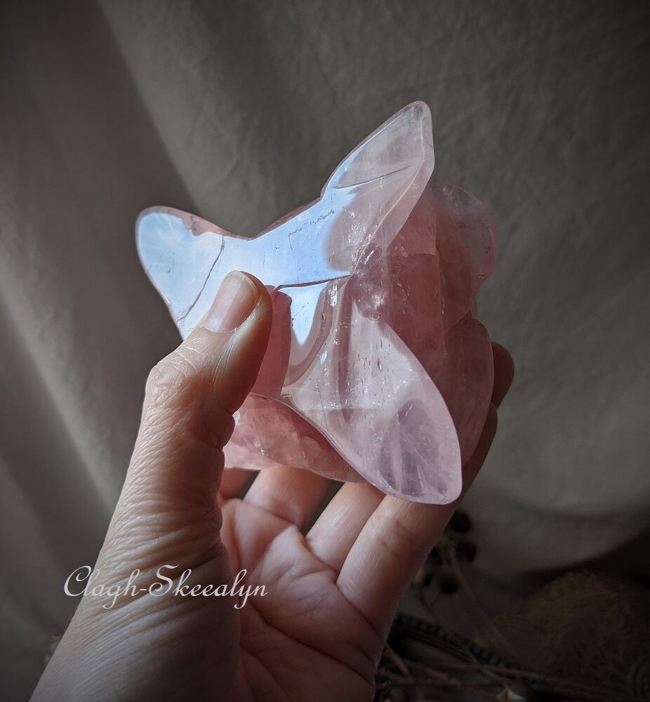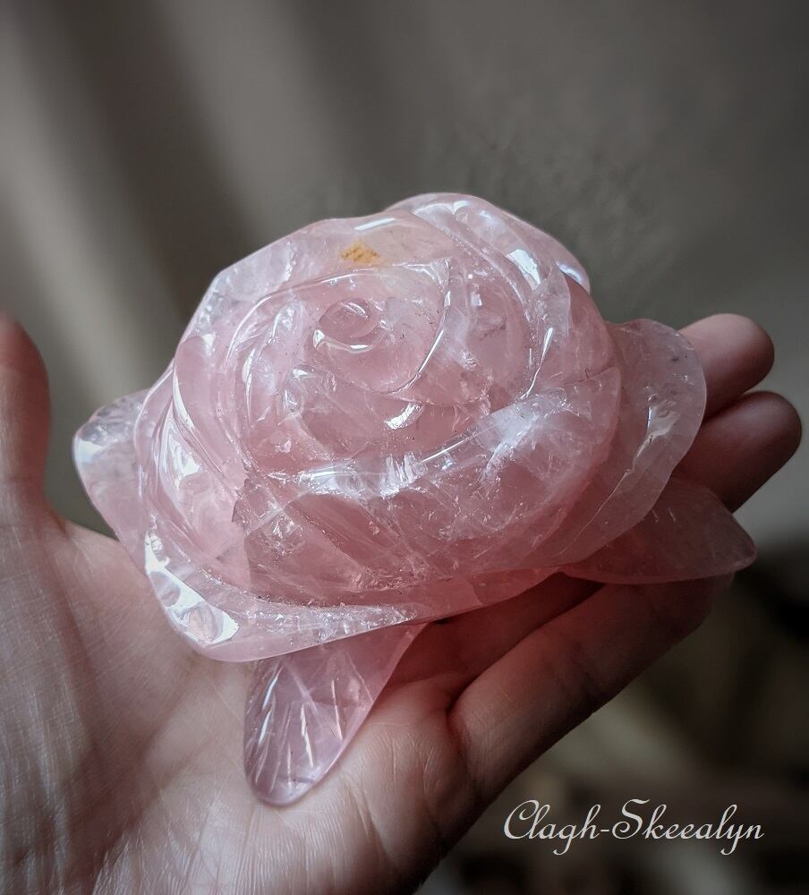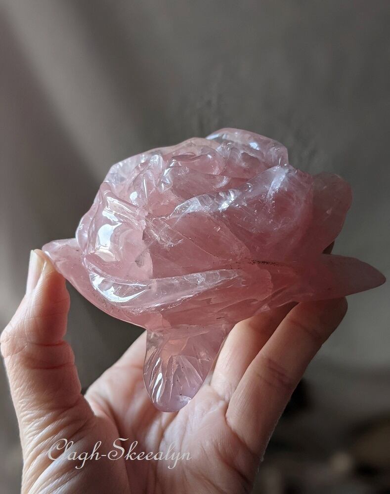 細部まで丁寧に彫刻された1点物で、ローズクォーツの柔らかいピンク色が薔薇の美しさに優しさを与えます。