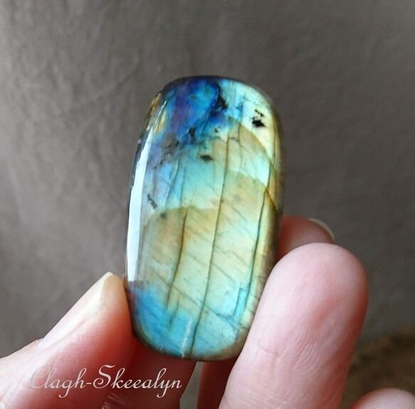 柔らかいイエロー~ブルー系の色彩を放つ、ラブラドライトの長方形ルース。
