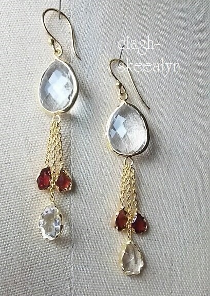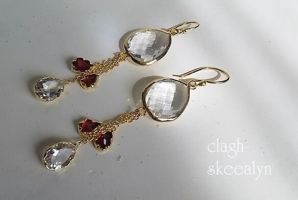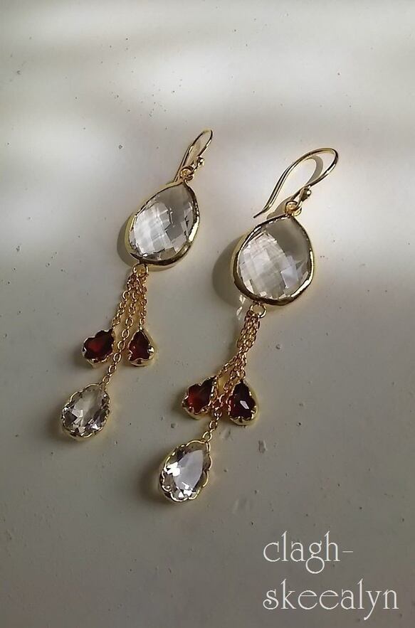 カッティングが美しい存在感のある水晶と、ドロップ型のガーネットが上品なピアスです。